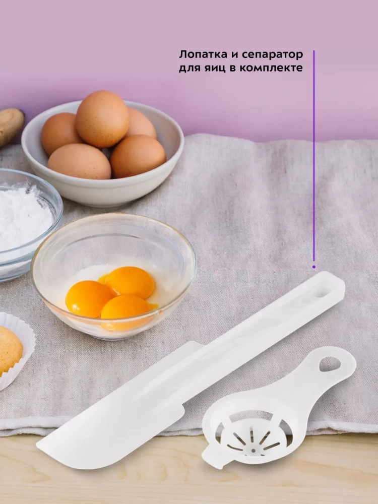 Также в комплекте есть лопатка для смешивания ингредиентов и сепаратор для яиц.