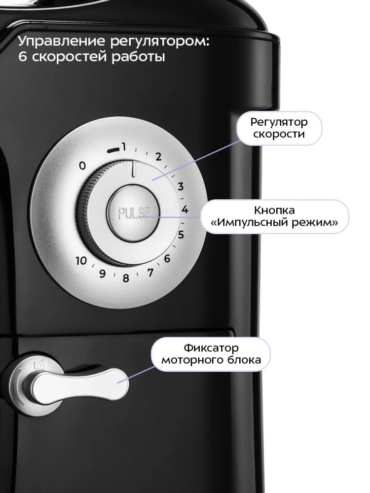 Миксер может работать в полностью автоматическом режиме. Вам достаточно только положить ингредиенты, надеть насадку и выбрать нужную скорость работы. Всего прибор имеет 10 скоростей и импульсный режим, который позволяет замешивать ингредиенты на максимальной скорости с частыми паузами.