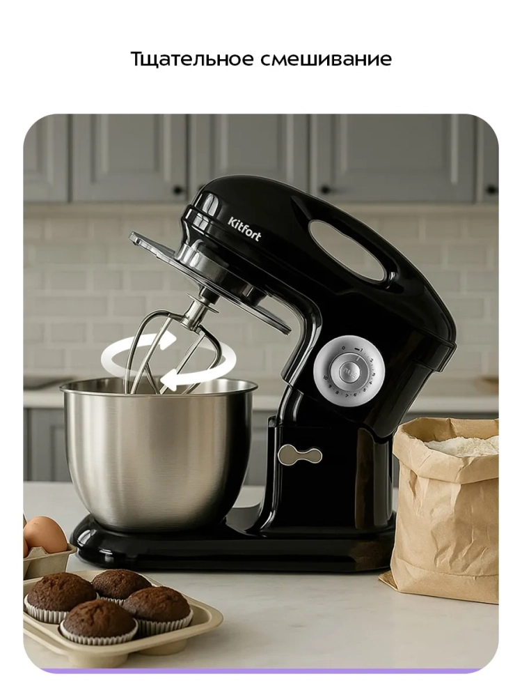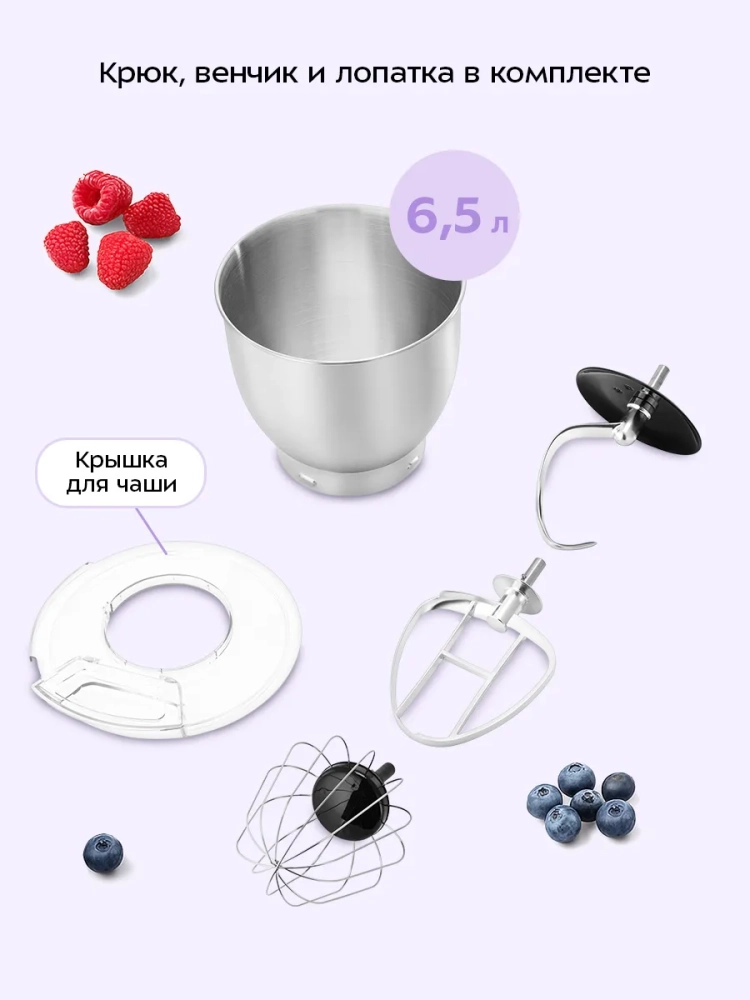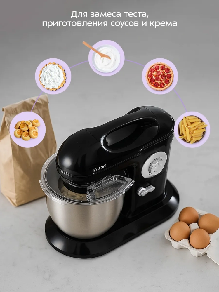 Планетарный миксер Kitfort КТ-4417 поможет вам смешать ингредиенты, взбить яичный белок или сливки, приготовить картофельное пюре, соус, крем, мусс, замесить жидкое тесто для блинов и крутое — для пельменей и пирогов. В комплект миксера входят три насадки.