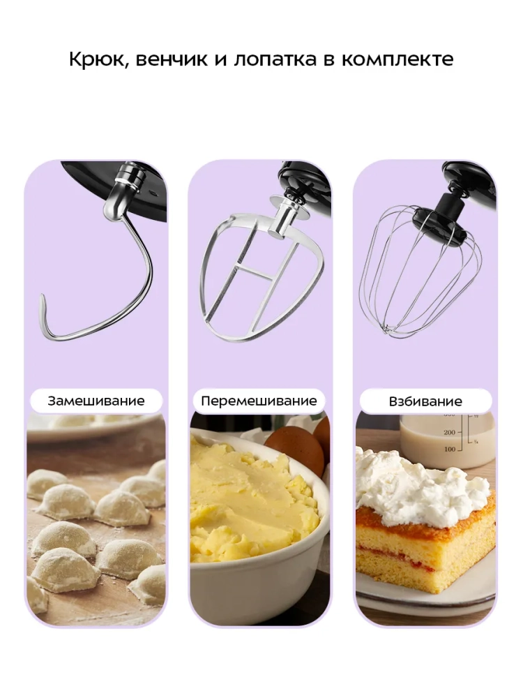 Венчик служит для взбивания яичных белков, сливок, замешивания жидкого теста. Насадка для смешивания используется для негустых ингредиентов, приготовления картофельного пюре, томатной пасты, кондитерских смесей, теста для тортов или блинов. Крюк для замешивания подойдет для замешивания густого теста.
