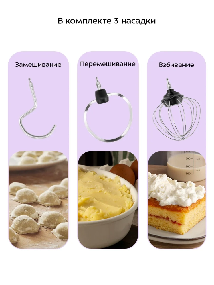 Венчик служит для взбивания яичных белков, сливок, замешивания жидкого теста. Насадка для смешивания используется для негустых ингредиентов, приготовления картофельного пюре, томатной пасты, кондитерских смесей, теста для тортов или блинов. Крюк для замешивания подойдет для замешивания густого теста. На крюке для замешивания есть защитная вставка, которая предотвращает попадание продуктов на шпиндель во время работы прибора.