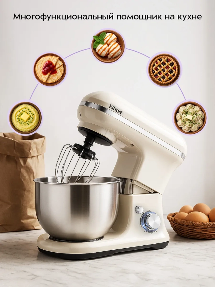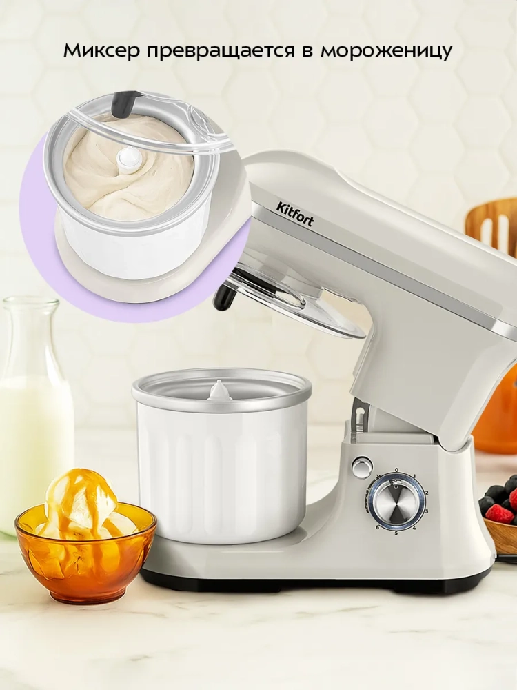 Планетарный миксер «2 в 1» Kitfort КТ-4418 поможет вам смешать ингредиенты, взбить яичный белок или сливки, приготовить картофельное пюре, соус, крем, мусс, замесить жидкое тесто для блинов и крутое — для пельменей и пирогов. В комплект миксера входят три насадки. Также с помощью данного миксера можно приготовить настоящее мороженое из натуральных продуктов, а также сорбет, джелато и замороженный йогурт.