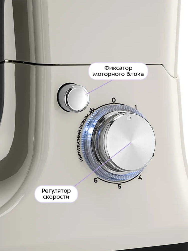 Миксер может работать в полностью автоматическом режиме. Вам достаточно только положить ингредиенты, надеть насадку и выбрать нужную скорость работы. Всего прибор имеет 6 скоростей и импульсный режим, который позволяет замешивать ингредиенты на максимальной скорости с частыми паузами.