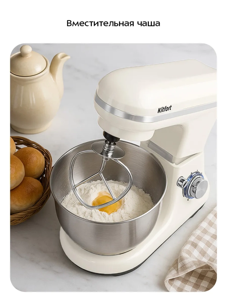 Миксер оснащен чашей емкостью 5 литров. Чаша изготовлена из нержавеющей стали, она прочная, и в ней можно смешивать даже горячие ингредиенты. Чаша закрепляется на моторном блоке и укомплектована защитной крышкой с отверстием, которое можно закрыть. Крышка предотвращает разбрызгивание ингредиентов при замешивании.