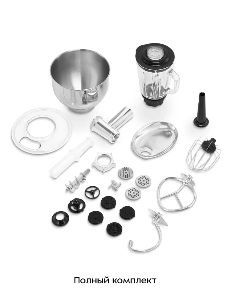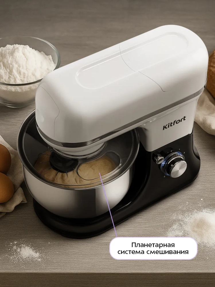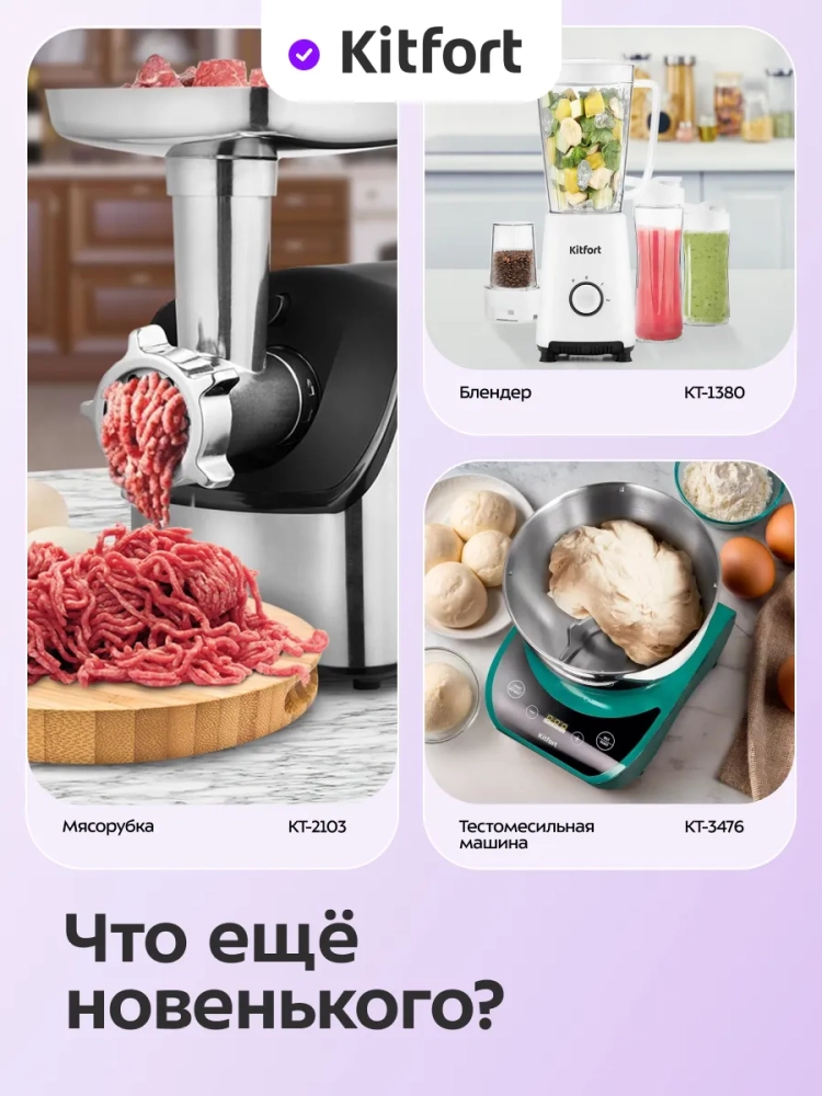 Многофункциональный планетарный миксер «3 в 1» Kitfort КТ-4420 поможет вам смешать ингредиенты, взбить яичный белок или сливки, приготовить соус, крем, мусс, замесить жидкое тесто для блинов и крутое — для пельменей и пирогов. Также он может перемолоть мясо на фарш и смешать фруктовые и фитнес-напитки, молочные коктейли и детское питание. В комплект входят мясорубка и блендер, что превращает эту модель в универсальную кухонную машину «3 в 1».