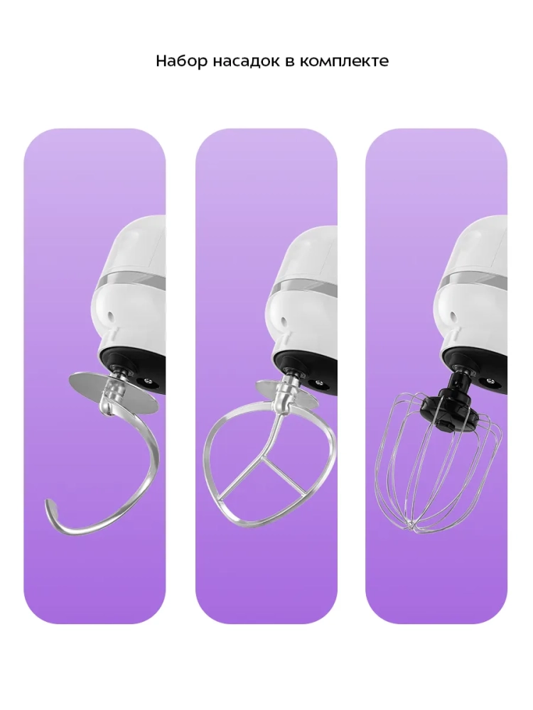 В комплекте к миксеру идут три насадки. Венчик служит для взбивания яичных белков, сливок, замешивания жидкого теста. Насадка для смешивания используется для негустых ингредиентов, приготовления картофельного пюре, томатной пасты, кондитерских смесей. Крюк для замешивания подойдет для замешивания густого теста.