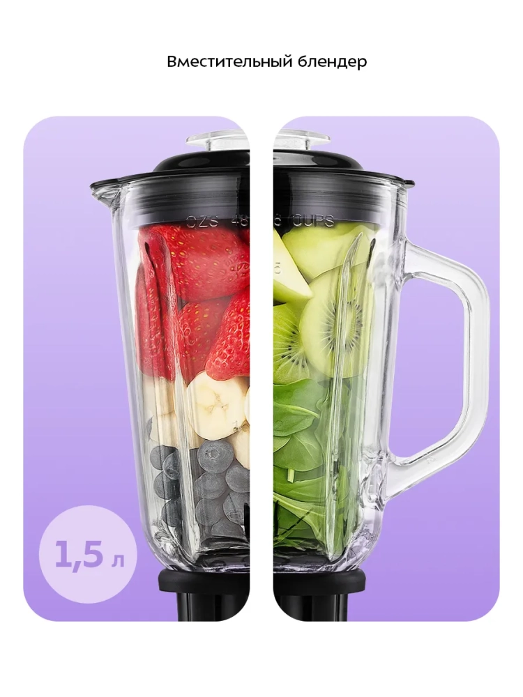 Блендер оснащен вместительной стеклянной чашей емкостью 1,5 л с мерной шкалой. В крышке чаши есть специальное отверстие, закрываемое мерным колпачком, для добавления ингредиентов непосредственно во время работы.
