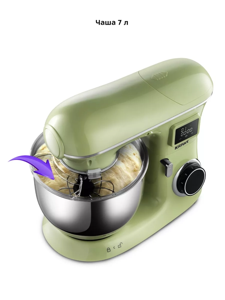 Миксер оснащен большой чашей емкостью 7 литров. Чаша изготовлена из нержавеющей стали, она прочная, и в ней можно смешивать даже горячие ингредиенты.
