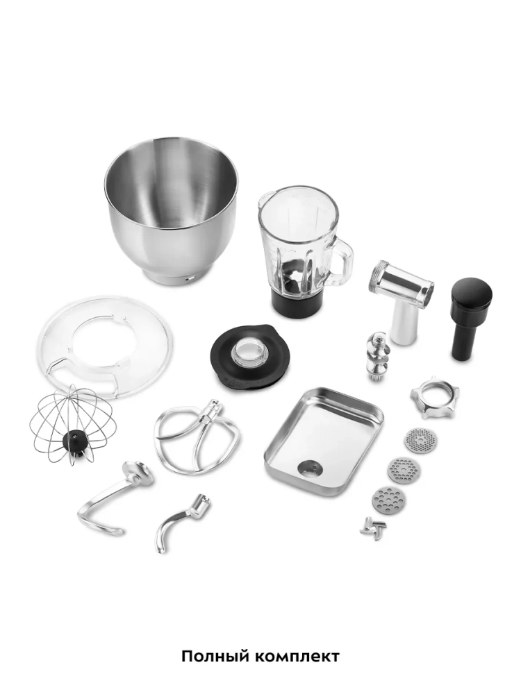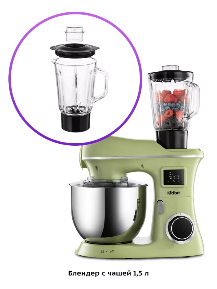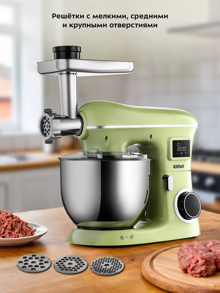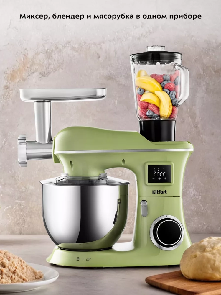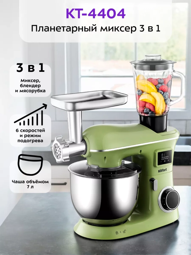 Планетарный миксер Kitfort КТ-4404 (3 в 1) поможет вам смешать ингредиенты, взбить яичный белок или сливки, приготовить картофельное пюре, соус, крем, мусс, замесить жидкое тесто для блинов и крутое — для пельменей и пирогов. Также он может перемолоть мясо на фарш и смешать фруктовые и фитнес-напитки, молочные коктейли, соусы и детское питание. В комплект входят мясорубка и блендер, что превращает эту модель в универсальную кухонную машину «3 в 1».