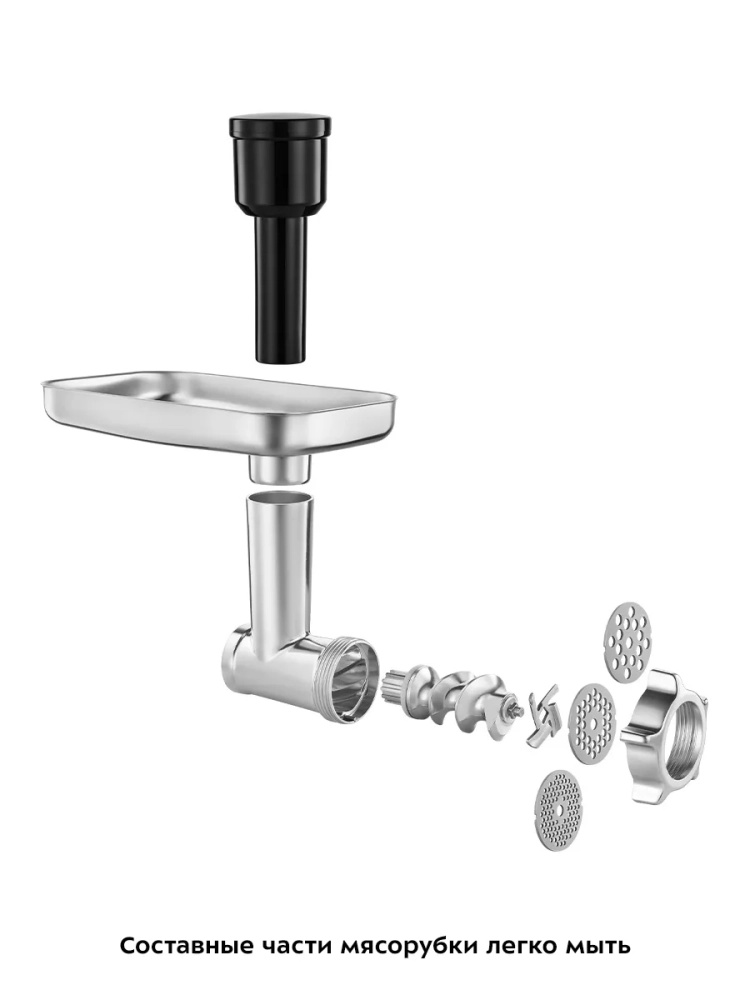 Мясорубка позволяет рубить мясо с производительностью 0,5 кг/мин. В комплекте идут 3 решетки с различным диаметром отверстий для приготовления фарша. Для мясорубки предусмотрены загрузочный лоток с толкателем, чтобы удобно и безопасно подавать продукты в загрузочный блок.