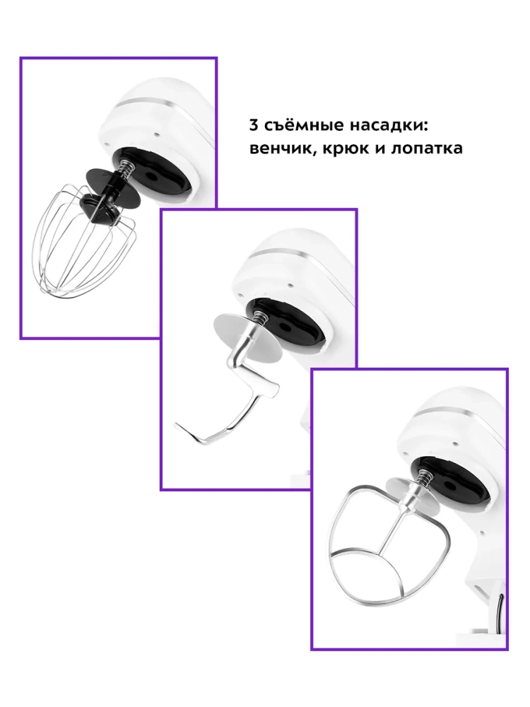 Электрический миксер оснащен чашей большого объема, что позволяет готовить большие порции теста для пиццы или других блюд. В комплекте идут различные насадки, которые делают этот кухонный комбайн универсальным: от тестомеса до венчика для взбивания. Это делает его идеальным выбором для любой кухни, будь то профессиональная или домашняя.