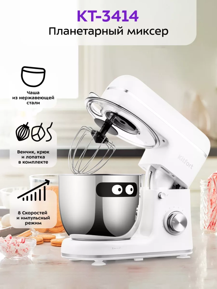 Планетарный миксер с чашей мощностью 1500 Вт — это незаменимый кухонный прибор для вашего дома. Этот многофункциональный кухонный комбайн от Kitfort станет отличным помощником на вашей кухне. Благодаря планетарной системе смешивания, миксер обеспечивает равномерное перемешивание ингредиентов, что особенно важно для замеса теста и приготовления яичного белка.