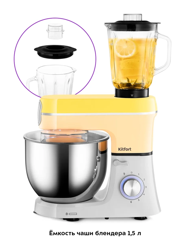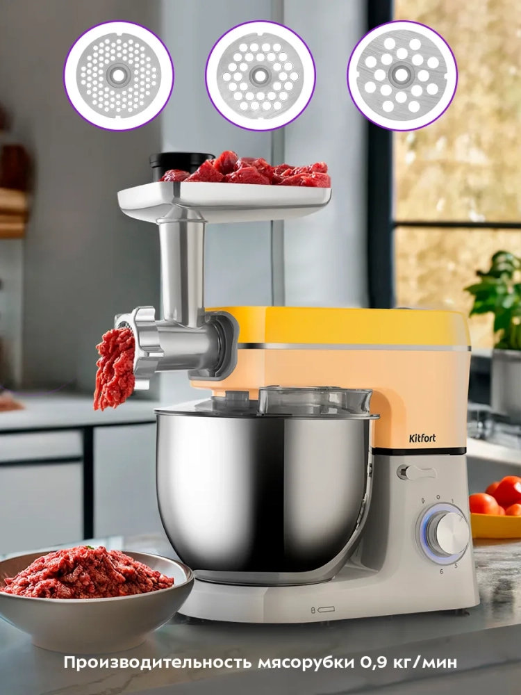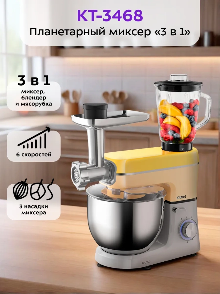 Многофункциональный планетарный миксер Kitfort «3 в 1» КТ-3468 поможет вам смешать ингредиенты, взбить яичный белок или сливки, приготовить картофельное пюре, соус, крем, мусс, замесить жидкое тесто для блинов и крутое — для пельменей и пирогов. Также он может перемолоть мясо на фарш и смешать фруктовые и фитнес-напитки, молочные коктейли, соусы и детское питание. В комплект входят мясорубка и блендер, что превращает эту модель в универсальную кухонную машину «3 в 1».