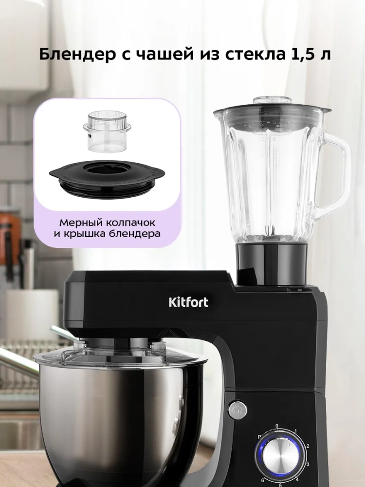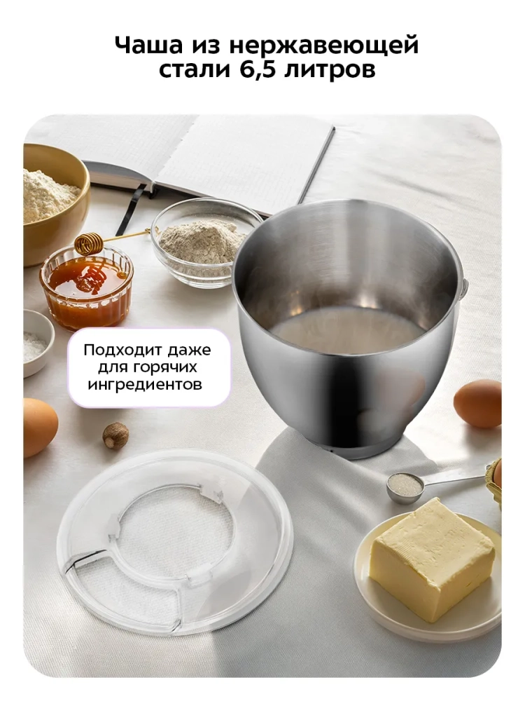 Планетарный миксер с чашей объемом 6.5 литров и мощностью 1400 Вт — это незаменимый помощник на вашей кухне. Этот кухонный прибор от Kitfort сочетает в себе функции миксера, блендера и тестомеса, обеспечивая высокую производительность и надежность. Миксер оснащен планетарной системой взбивания, что позволяет равномерно перемешивать ингредиенты в чаше, обеспечивая идеальную консистенцию теста или крема.