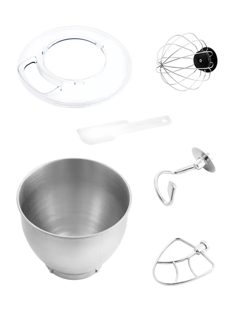 Миксер оснащен большой чашей объемом 6 литров. Форма насадок и чаши подобраны так, что при любом количестве продуктов насадка не оставляет их по краям неперемешанными.