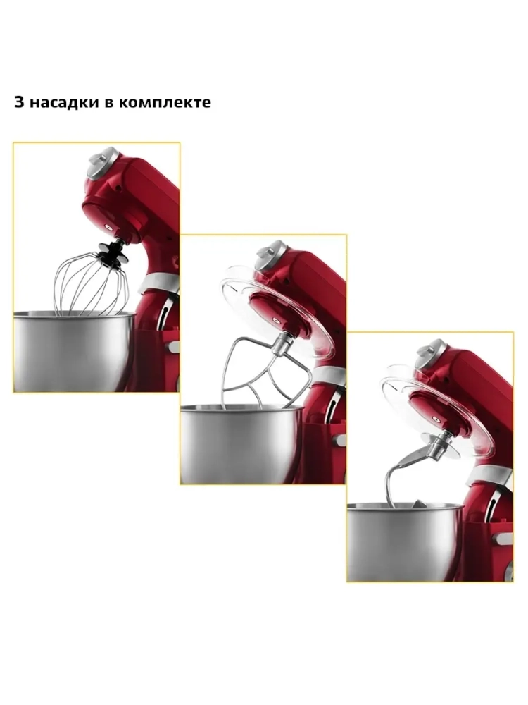 В комплекте идут венчик для взбивания, насадка для перемешивания и приготовления пюре и крюк для замеса крутого теста.