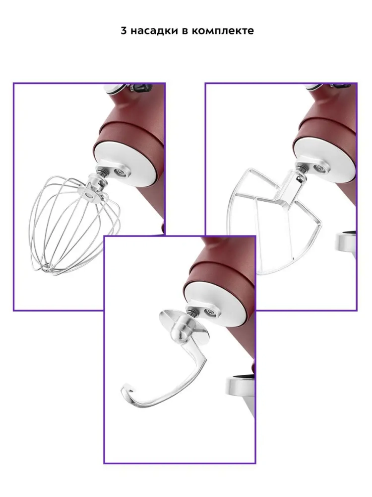 К миксеру отдельно можно приобрести дополнительные насадки — мясорубку, тестораскатку и насадки для приготовления пасты, они в комплектацию не входят.