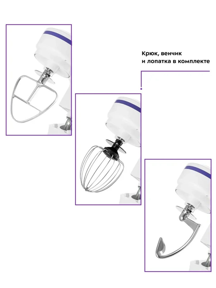 В комплекте идут венчик для взбивания, крюк для замеса крутого теста и насадка для смешивания и приготовления пюре.