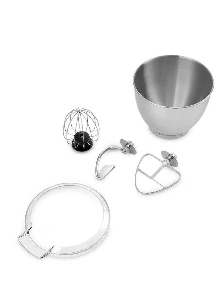 В комплекте идут венчик для взбивания, крюк для замеса крутого теста и насадка для смешивания и приготовления пюре.