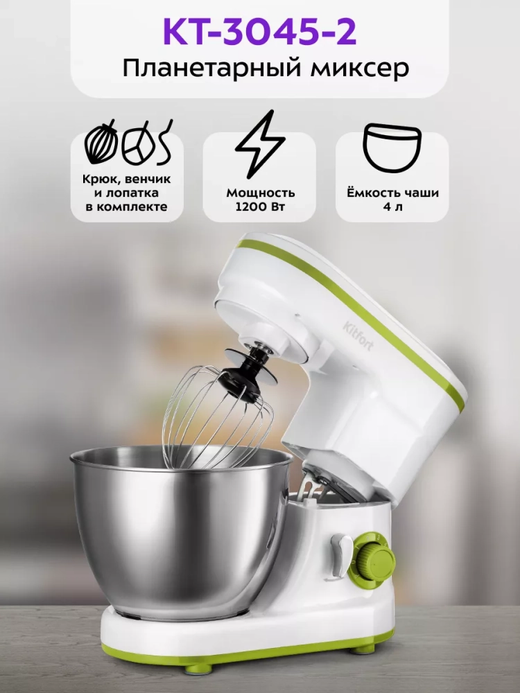 Многофункциональный и мощный планетарный миксер Kitfort КТ-3045 поможет вам смешать ингредиенты, взбить яичный белок или сливки, приготовить картофельное пюре, соус, крем, мусс, замесить жидкое тесто для блинов и крутое — для пельменей и пирогов.