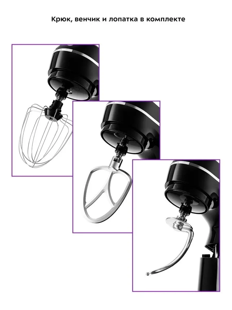 В комплекте идут насадки для взбивания, смешивания и замеса крутого теста.