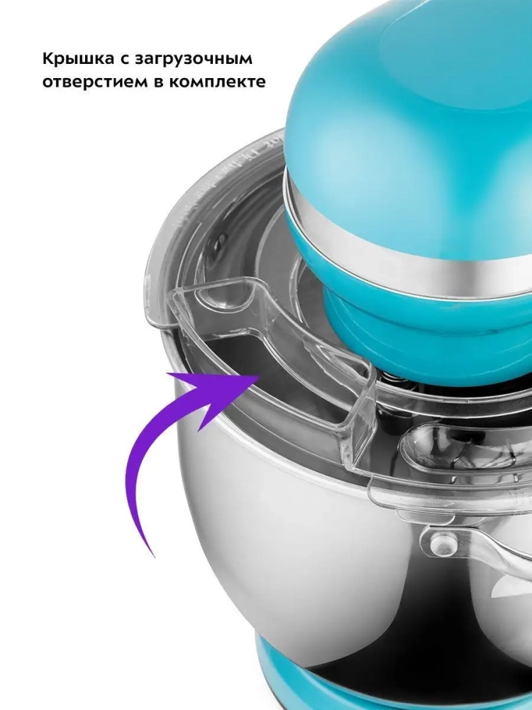 Чаша фиксируется на корпусе миксера и укомплектована защитной крышкой с отверстием. Крышка предотвращает разбрызгивание ингредиентов при замешивании. Добавлять ингредиенты во время работы можно через загрузочную горловину в крышке, не выключая миксер и не откидывая моторный блок.