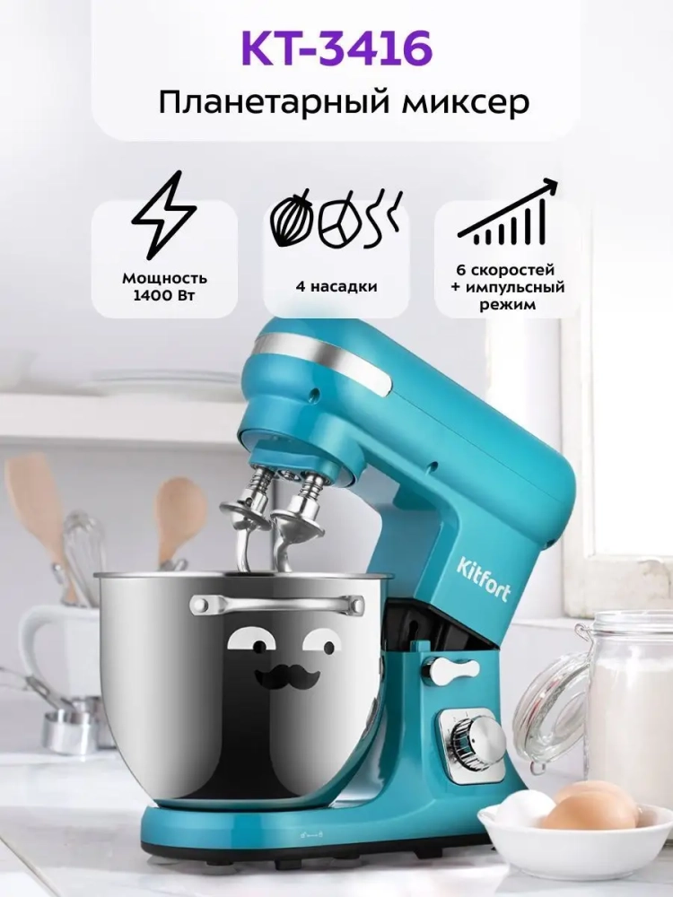 Планетарный миксер Kitfort КТ-3416 поможет вам смешать ингредиенты для любого блюда, взбить яичный белок или сливки, приготовить картофельное пюре, мусс, крем, соус, замесить жидкое тесто для блинов или крутое для пельменей и пирогов.