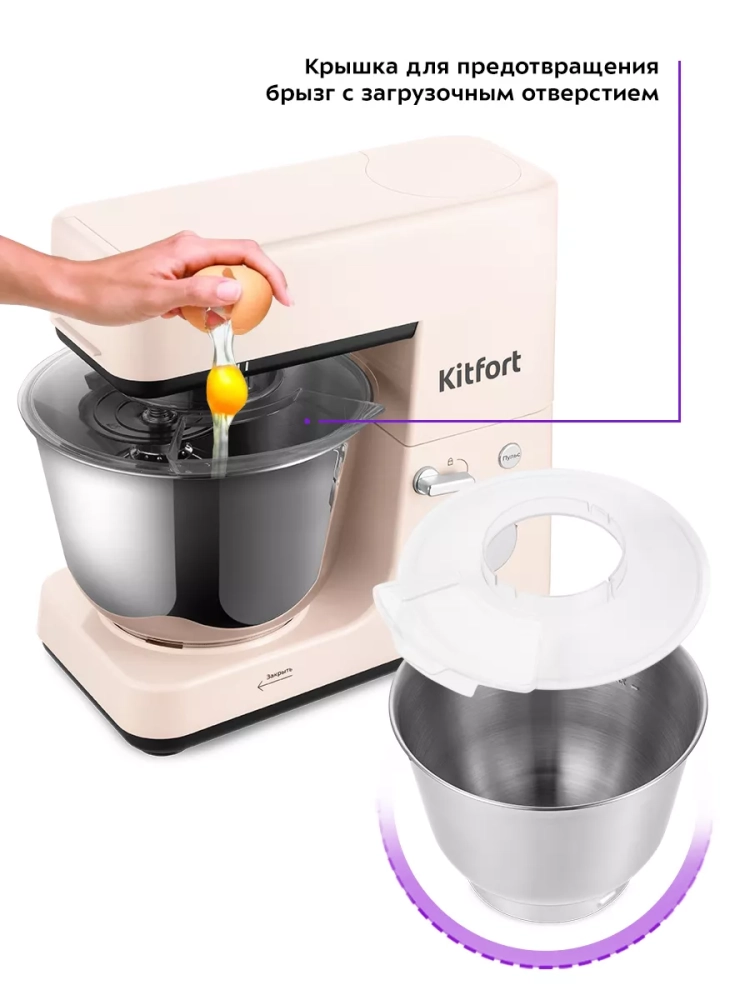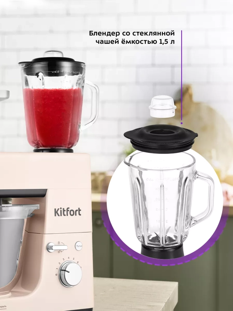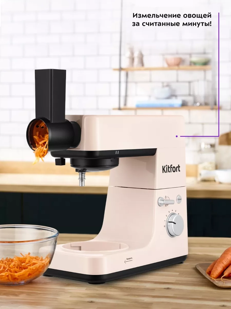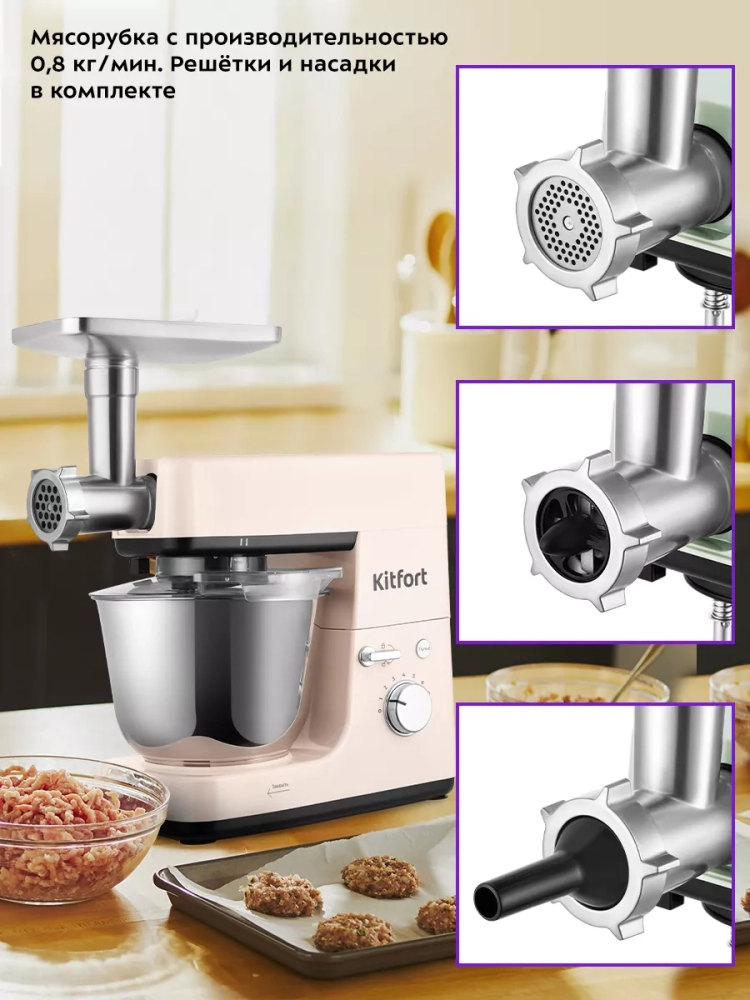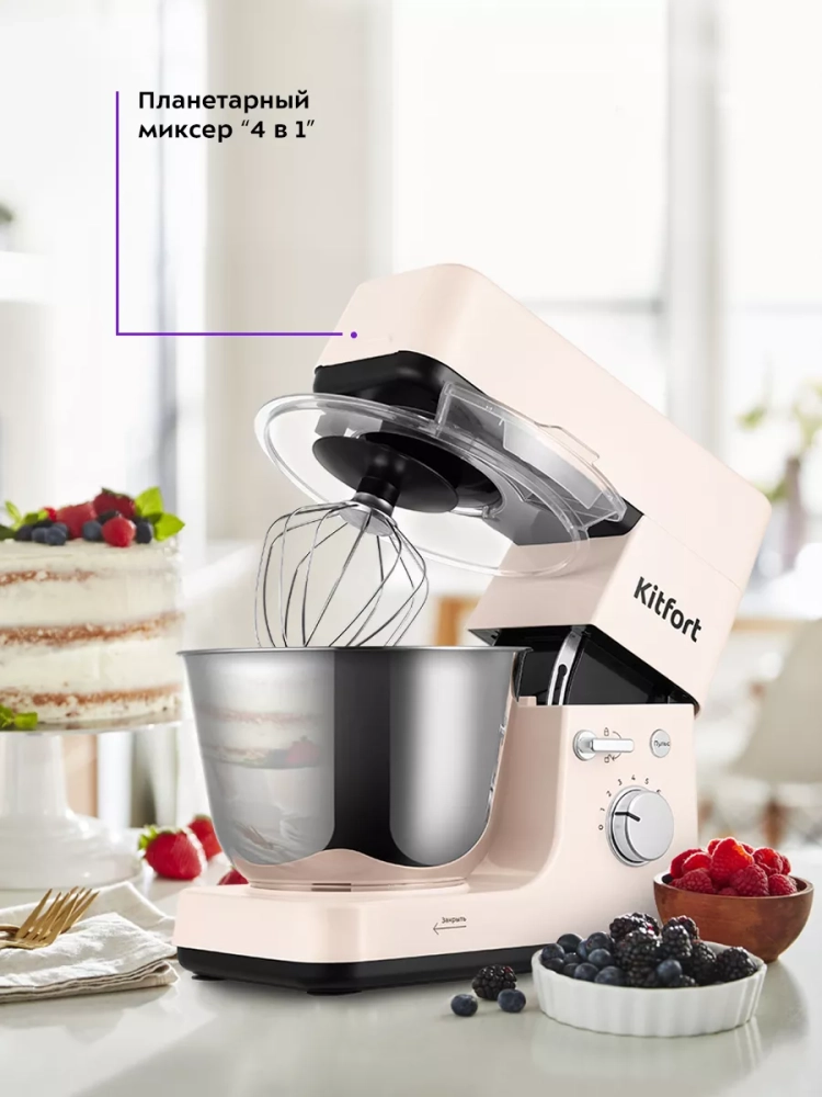 Многофункциональный планетарный миксер Kitfort КТ-3419 (4 в 1) поможет вам смешать ингредиенты, взбить яичный белок или сливки, приготовить картофельное пюре, соус, крем, мусс, замесить жидкое тесто для блинов и крутое — для пельменей и пирогов. В комплект также входит мясорубка, овощерезка и блендер, что превращает эту модель в универсальную кухонную машину «4 в 1».