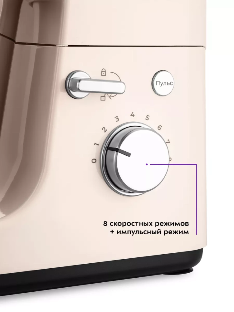 При включении миксера скорость вращения регулируется, чтобы предотвратить разбрызгивание ингредиентов. У прибора 8 скоростей и импульсный режим, который позволяет замешивать ингредиенты на максимальной скорости с частыми паузами.