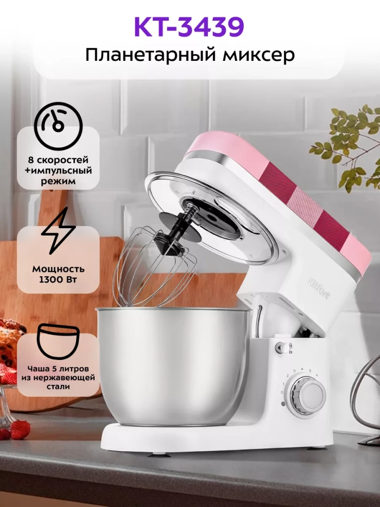 Планетарный миксер Kitfort КТ-3439 поможет вам смешать ингредиенты, взбить яичный белок или сливки, приготовить картофельное пюре, соус, крем, мусс, замесить жидкое тесто для блинов и крутое — для пельменей и пирогов. В комплекте миксера имеется три насадки.