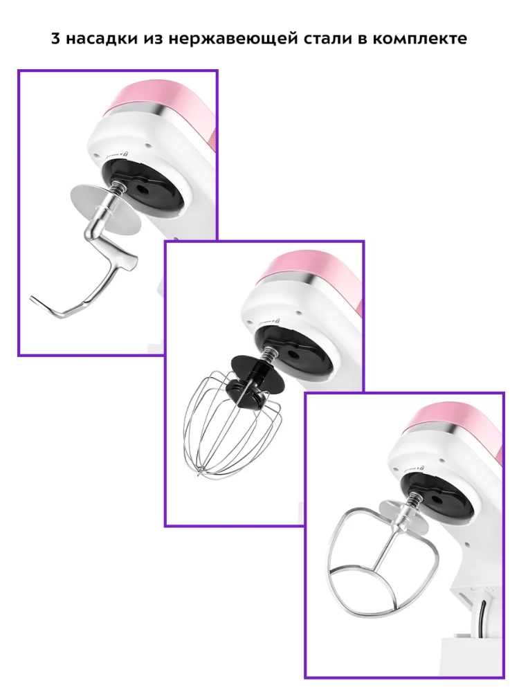 Венчик служит для взбивания яичных белков, сливок, замешивания жидкого теста. Насадка для смешивания используется для негустых ингредиентов, приготовления картофельного пюре, томатной пасты, кондитерских смесей, теста для тортов или блинов. Крюк для замешивания подойдет для замешивания густого теста.