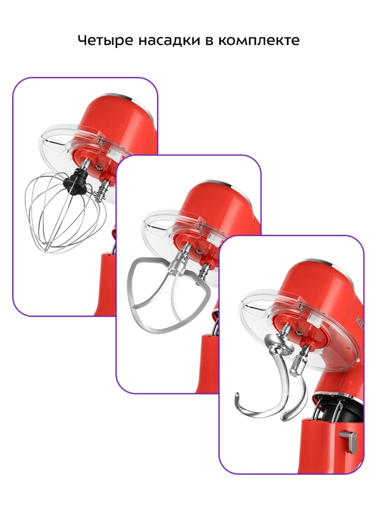 В комплекте к миксеру идут венчик для взбивания, насадка для смешивания и два крюка для замешивания. Венчик служит для взбивания яичных белков, сливок, замешивания жидкого теста. Насадка для смешивания используется для негустых ингредиентов, приготовления картофельного пюре, томатной пасты, кондитерских смесей, теста для тортов. Крюки для замешивания подойдут для замешивания густого теста.