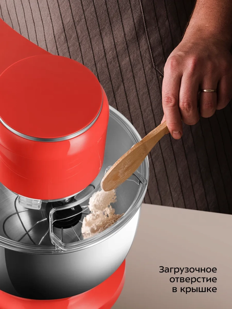 Миксер оснащен двумя чашами емкостью 6 и 7 литров. Чаши изготовлены из нержавеющей стали, они прочные и в них можно смешивать даже горячие ингредиенты. Вы можете выбрать любую чашу в зависимости от объема ингредиентов. Чаша закрепляется на моторном блоке и укомплектована защитной крышкой с загрузочным отверстием. Крышка предотвращает разбрызгивание ингредиентов при замешивании. А через загрузочное отверстие можно добавлять ингредиенты во время работы, не выключая миксер и не поднимая моторный блок.