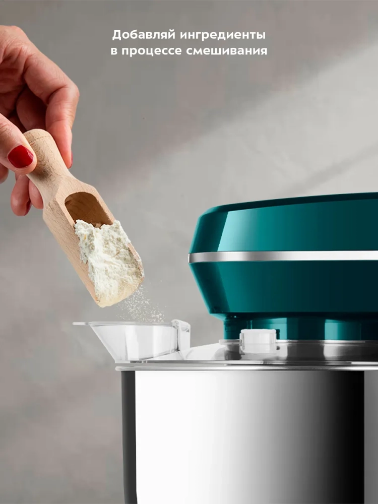 Миксер оснащен планетарной системой смешивания: во время работы насадка вращается вокруг своей оси и одновременно движется по окружности по внутреннему объему чаши. Это обеспечивает идеальное качество смешивания без комков.