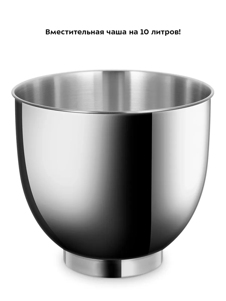 Миксер оснащен большой чашей емкостью 10 литров. Чаша изготовлена из нержавеющей стали, она прочная, и в ней можно смешивать даже горячие ингредиенты.