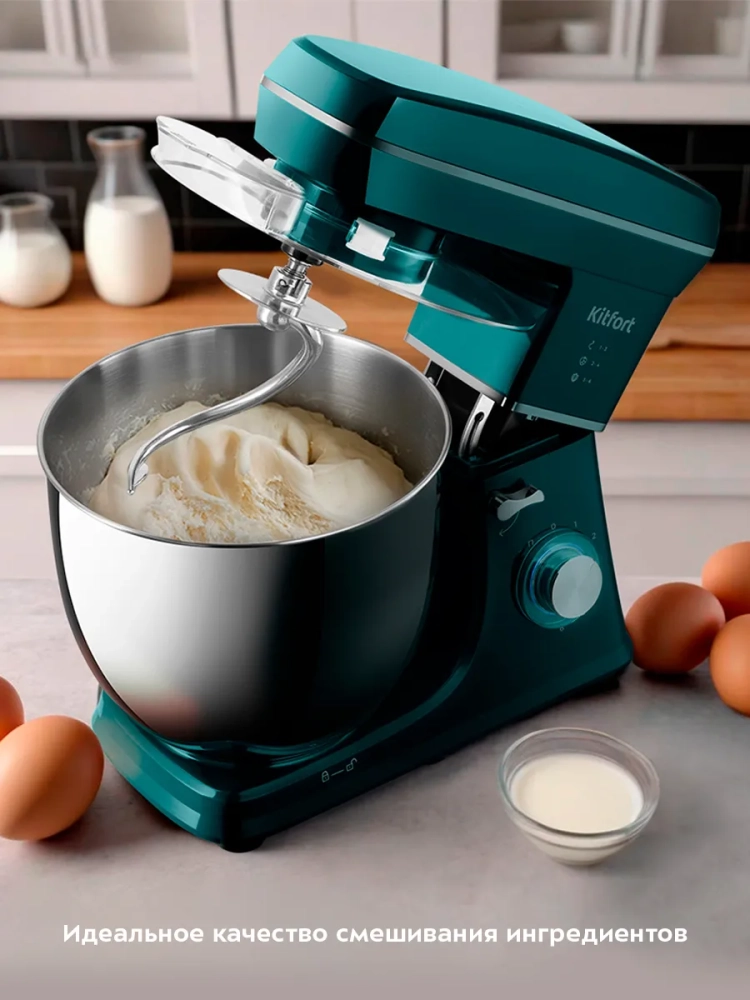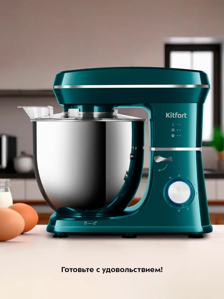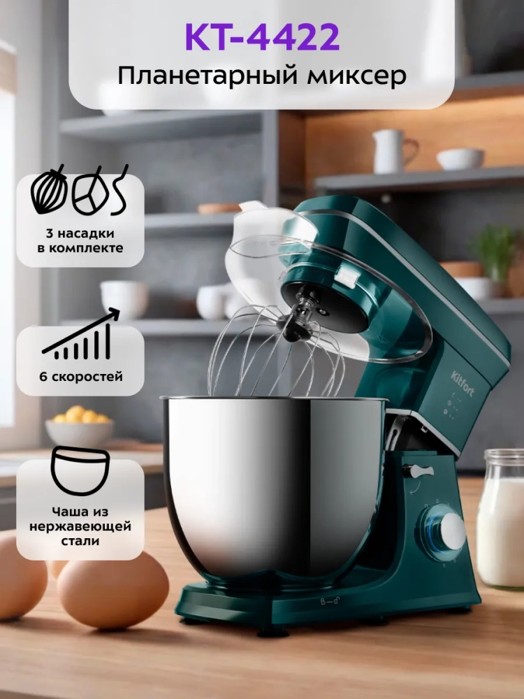 Планетарный миксер Kitfort КТ-4422 поможет вам смешать ингредиенты, взбить яичный белок или сливки, приготовить картофельное пюре, соус, крем, мусс, замесить жидкое тесто для блинов и крутое — для пельменей и пирогов.