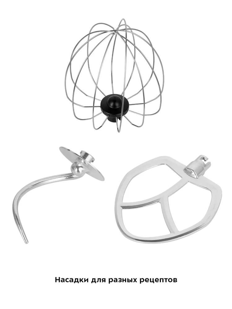 В комплекте есть три насадки. Венчик служит для взбивания яичных белков, сливок, замешивания жидкого теста. Насадка для смешивания используется для негустых ингредиентов, приготовления картофельного пюре, томатной пасты, кондитерских смесей или теста для тортов. Крюк для замешивания подойдет для замешивания густого теста.