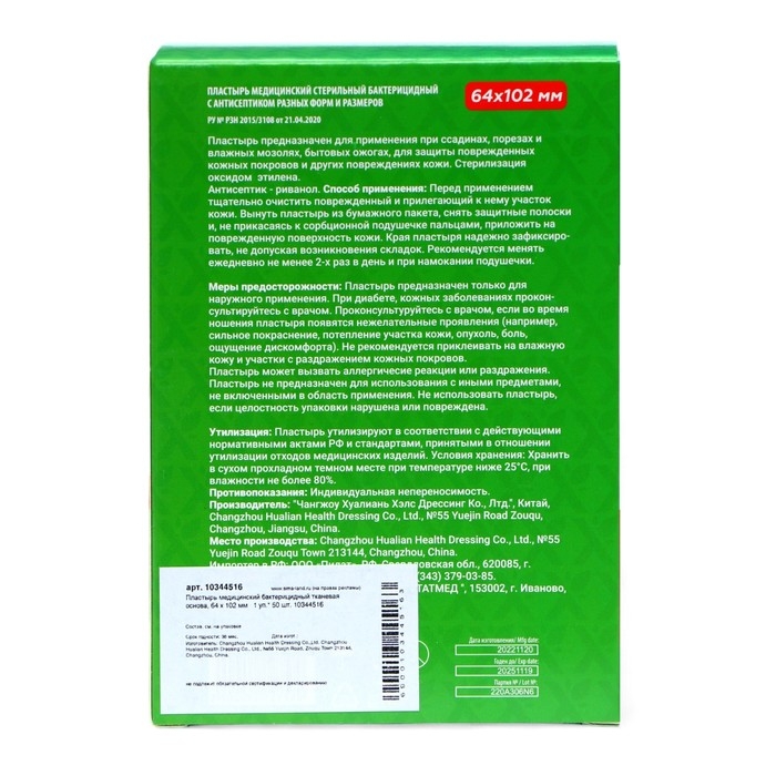 Пластырь медицинский бактерицидный тканевая основа, 64 х 102 мм 1 уп.* 50 шт.