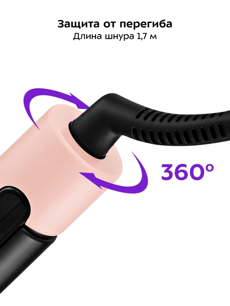 Шнур оснащен защитой от перегиба, что увеличивает срок службы прибора. Вращение шнура на 360° обеспечивает удобство в использовании плойки для волос — провод не сматывается и не путается при повороте устройства, а поворачивается вместе с ним.