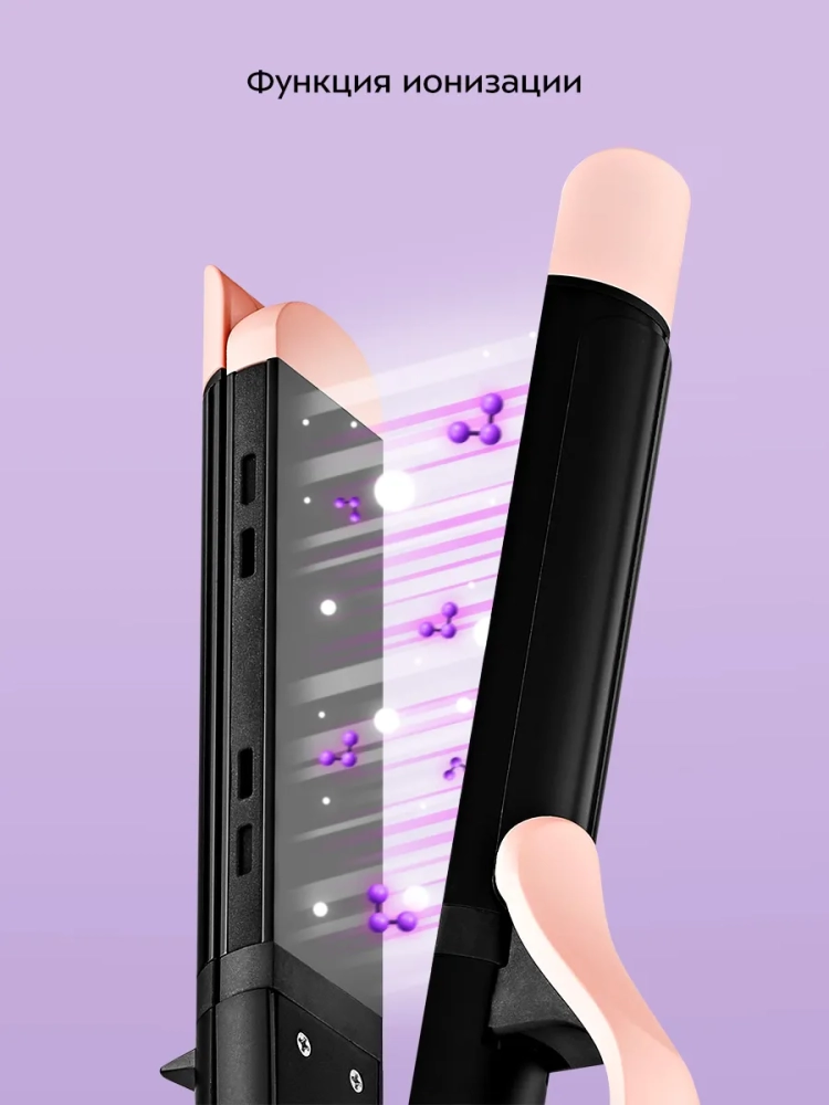 Функция ионизации минимизирует негативное влияние высоких температур на структуру волос и способствует снятию статического электричества, делая локоны более послушными. Отрицательно заряженные ионы воздействуют на волосяные чешуйки, позволяя сохранить гидробаланс в стержне волоса.