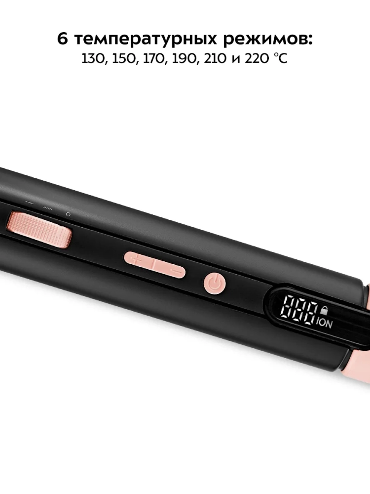 У плойки 6 температурных режимов: 130, 150, 170, 190, 210 и 220 °С. Дисплей поможет понять, какая температура выбрана и когда прибор готов к работе. Температура на дисплее мигает во время нагрева и горит непрерывно, когда устройство нагрелось до выбранной температуры. У прибора также есть функция блокировки кнопок: во время укладки вы не собьете настройку температуры случайным нажатием. Благодаря небольшим выступам снизу корпуса прибора горячие пластины плойки не соприкасаются с поверхностью, на которой расположен прибор, защищая ее от повреждений высокими температурами.
