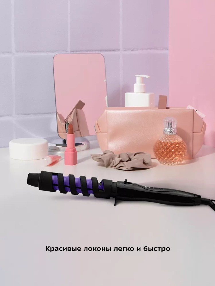 Керамическое покрытие рабочей поверхности бережно выравнивает структуру волос, делая их гладкими и блестящими, а также снимает статическое электричество. Спираль на рабочей поверхности, которая позволяет направлять локон, выполнена из пластика, чтобы плойку было легко держать в руке.