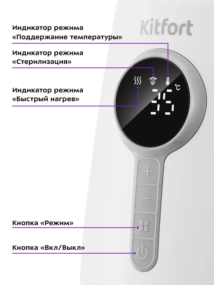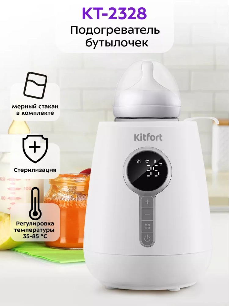 В подогревателе бутылочек Kitfort КТ-2328 можно подогреть и разморозить детское питание или молоко, простерилизовать мелкие детские предметы, такие как соски, пустышки и прочее, а также разогреть пюре в баночках. У прибора три режима работы: «Быстрый нагрев», «Поддержание температуры» и «Стерилизация».