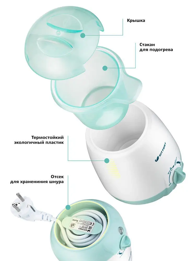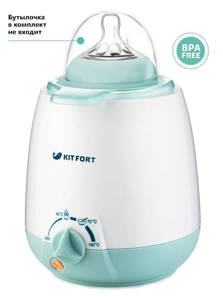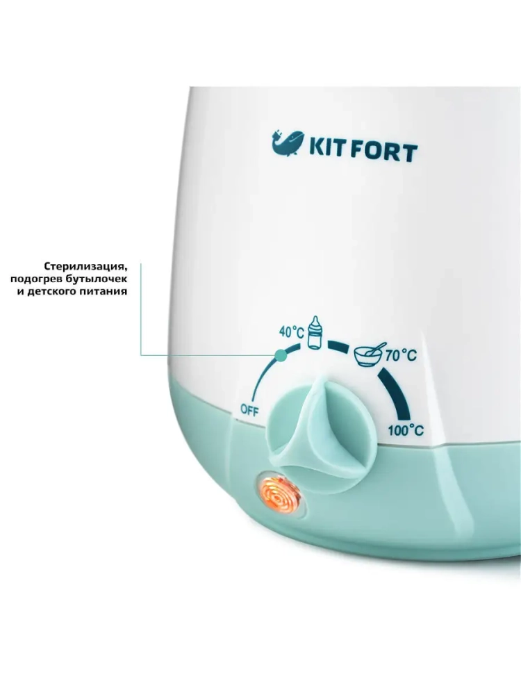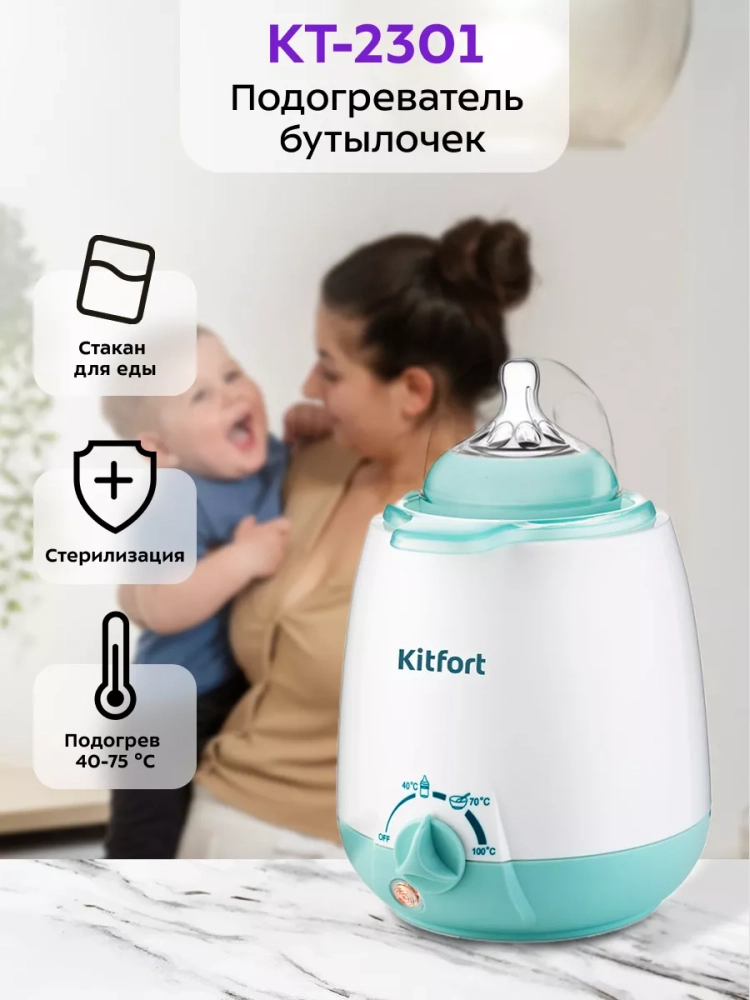 Подогреватель бутылочек Kitfort КТ-2301 предназначен для подогревания детского питания в пластиковых бутылочках, стеклянных и металлических баночках, а также в стакане из комплекта. Подогреватель можно применять для размораживания молока, нагрева детского питания до температур 50-70 *С и для стерилизации сосок и пустышек.