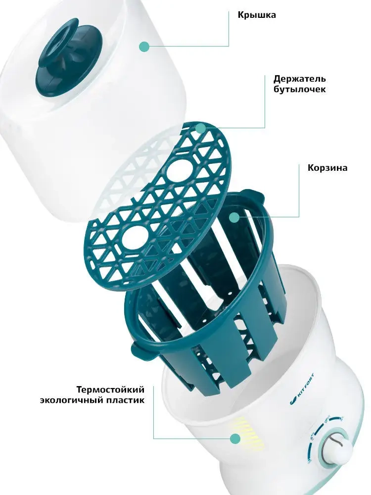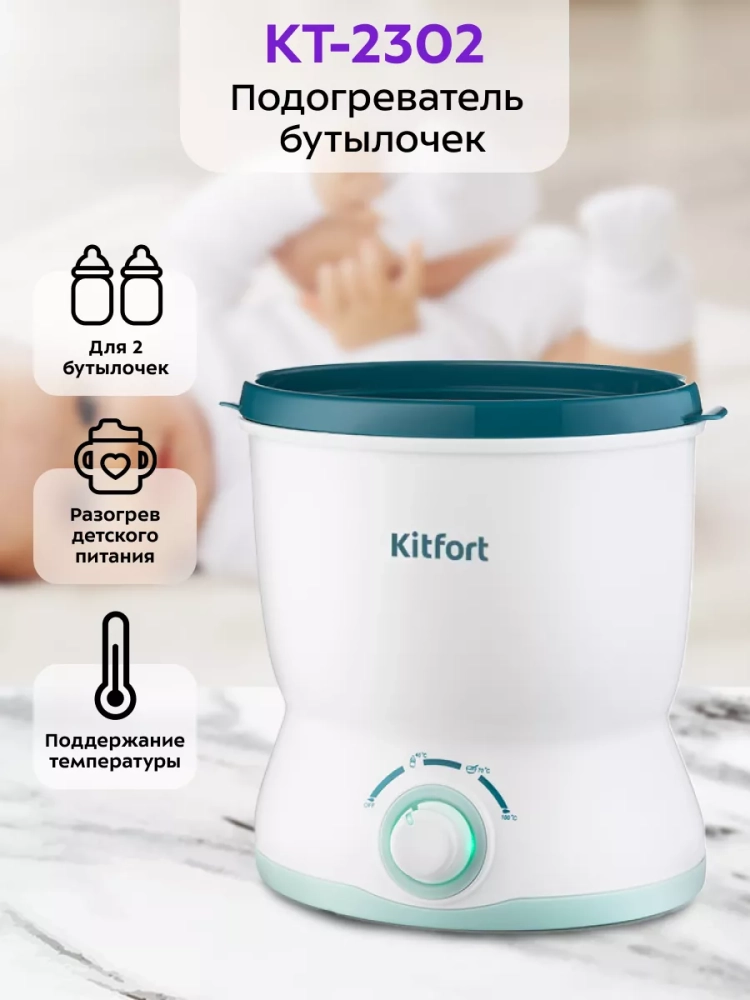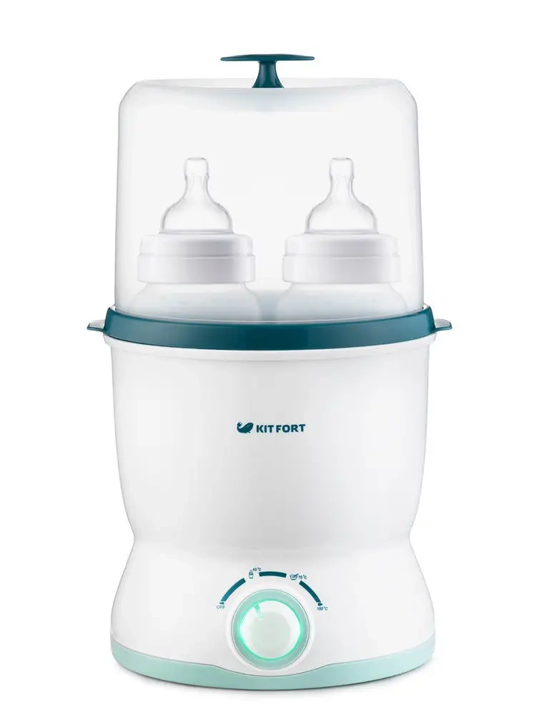 Подогреватель бутылочек Kitfort КТ-2302 предназначен для подогревания детского питания в пластиковых бутылочках, стеклянных и металлических баночках, а также в стакане из комплекта. Подогреватель можно применять для размораживания молока, нагрева детского питания до температур 40-70 *С и для стерилизации бутылочек, сосок и пустышек.