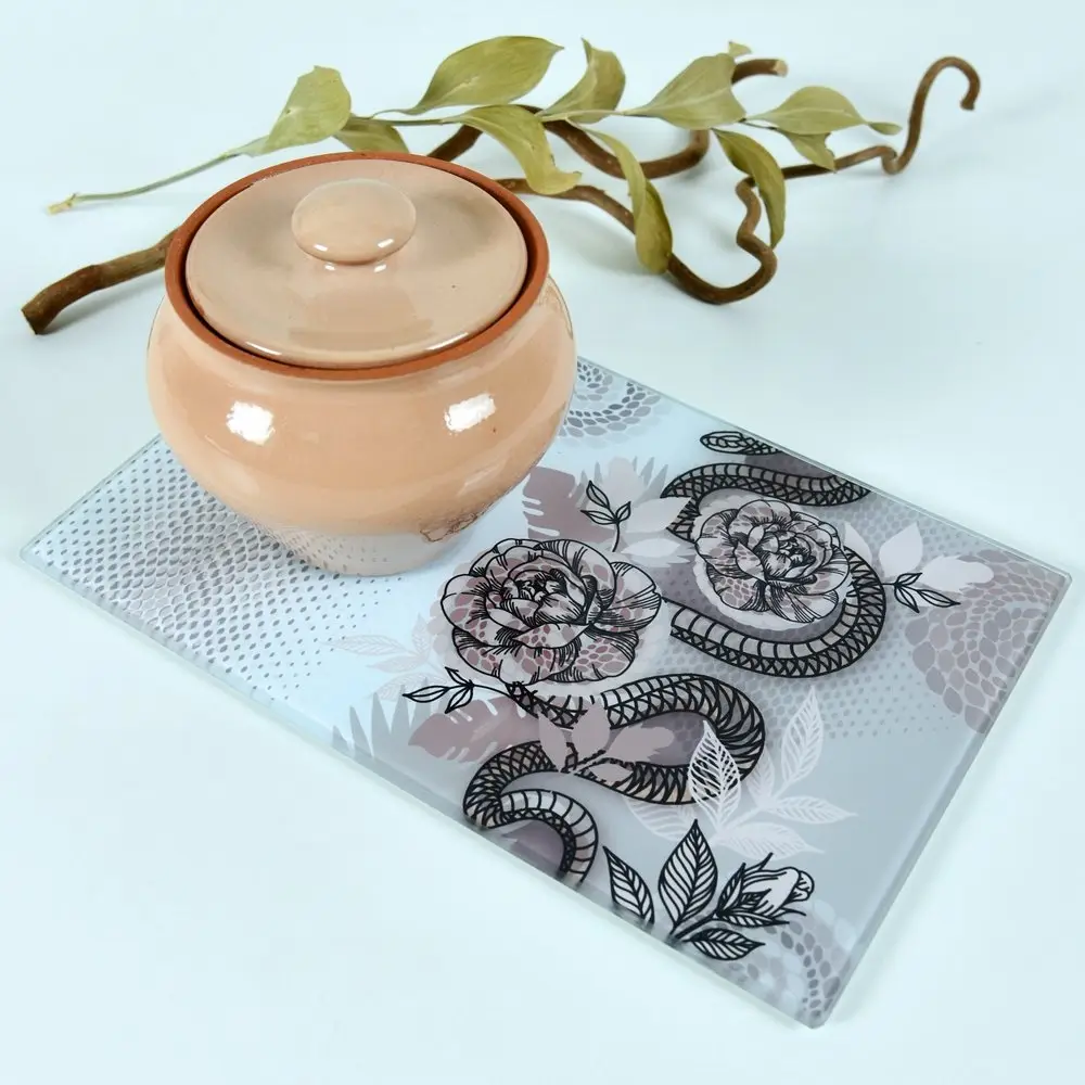 Доска разделочная из стекла – это удобный и функциональный предмет кухонной утвари, который поможет вам не только нарезать и разделывать продукты, но и защитит поверхность вашего стола от повреждений и горячих предметов. Доска выполнена из прочного и безопасного материала – закаленного стекла, которое не впитывает запахи и не задерживает бактерии. На поверхности доски нанесен красочный рисунок, который придаст вашей кухне индивидуальность и уют. Подставка под горячее имеет специальные ножки, которые обеспечивают ее стабильность на любой поверхности. Она станет отличным подарком для любого любителя кулинарии. Перед первым использованием и после каждого применения промыть в теплой воде, можно с жидким моющим средством, сполоснуть проточной водой и просушить. Нельзя мыть в посудомоечной машине.