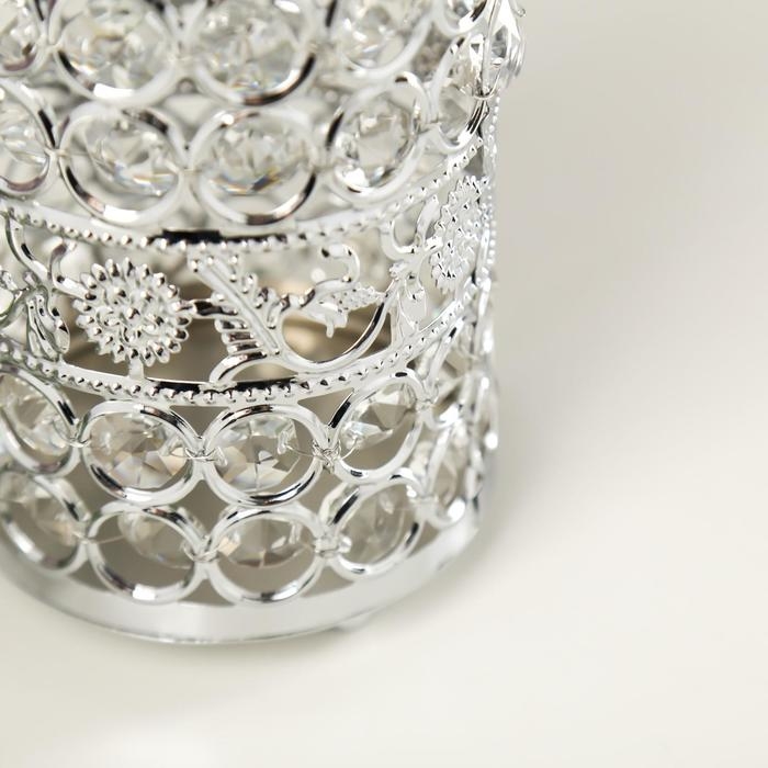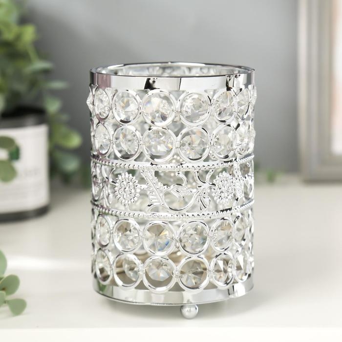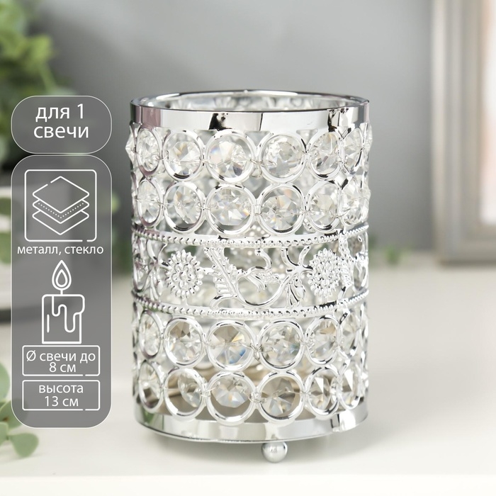 Подсвечник металл, стекло на 1 свечу "Кристаллы и подсолнухи" серебро 13х9х9 см