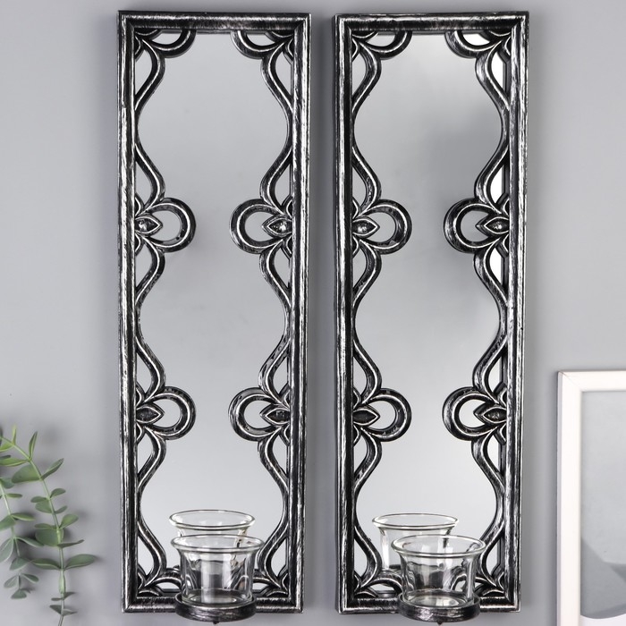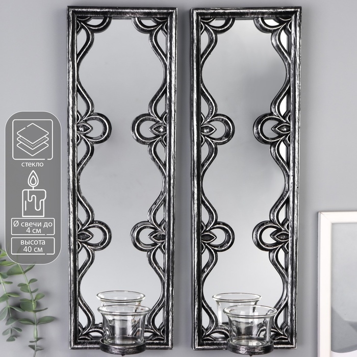 Подсвечник пластик, стекло на 1 свечу "Зеркальные узоры" набор 2 шт d-4 см сереб. 8х13х40 см 90688