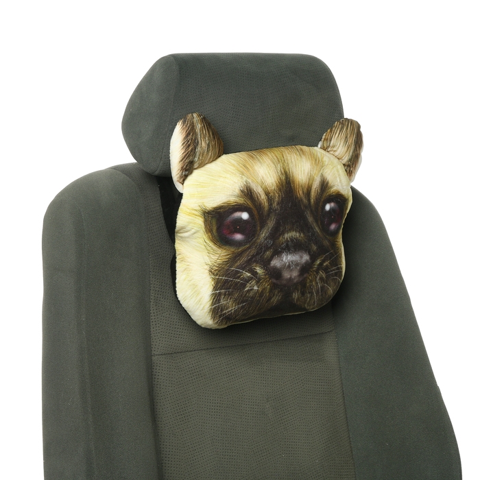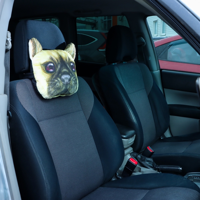Подушка на подголовник в виде мопса - это забавный и функциональный аксессуар для автомобиля. Размеры подушки составляют 30x25x10 см, а крепится она на резинке к подголовнику сиденья.