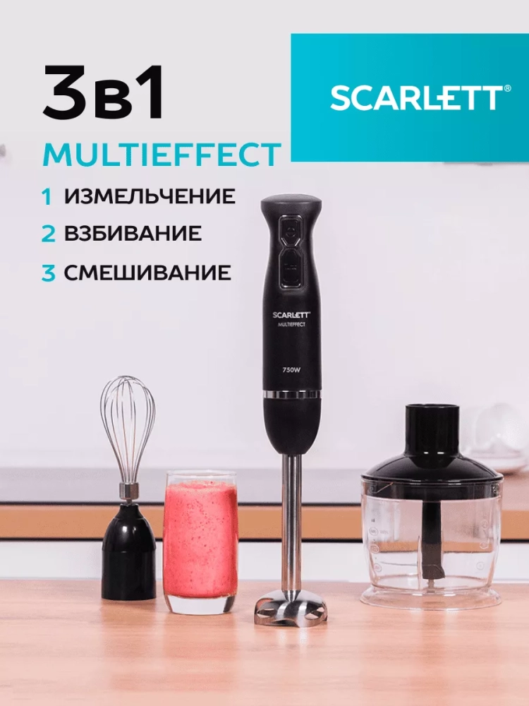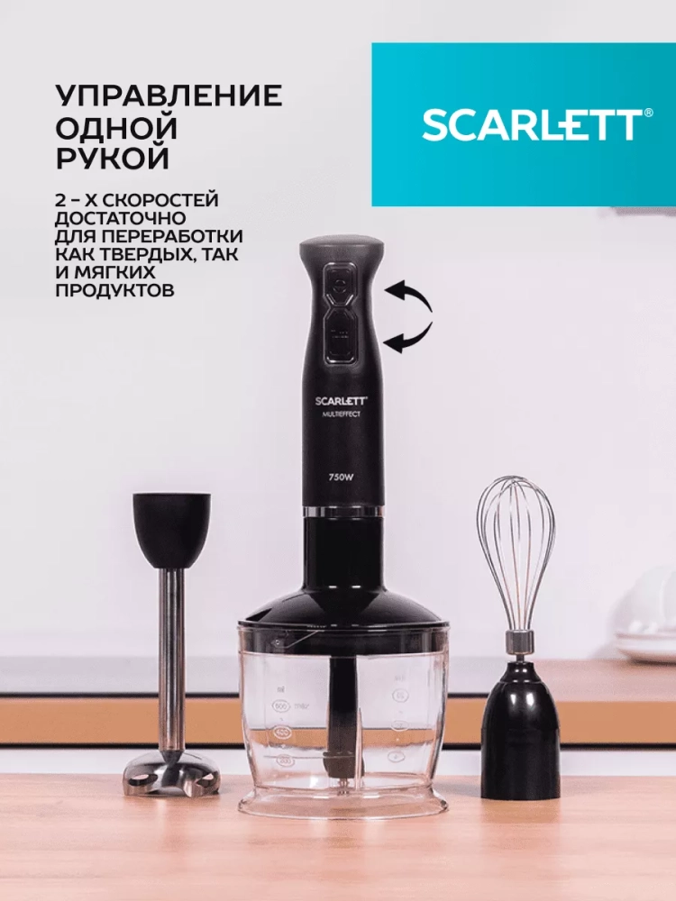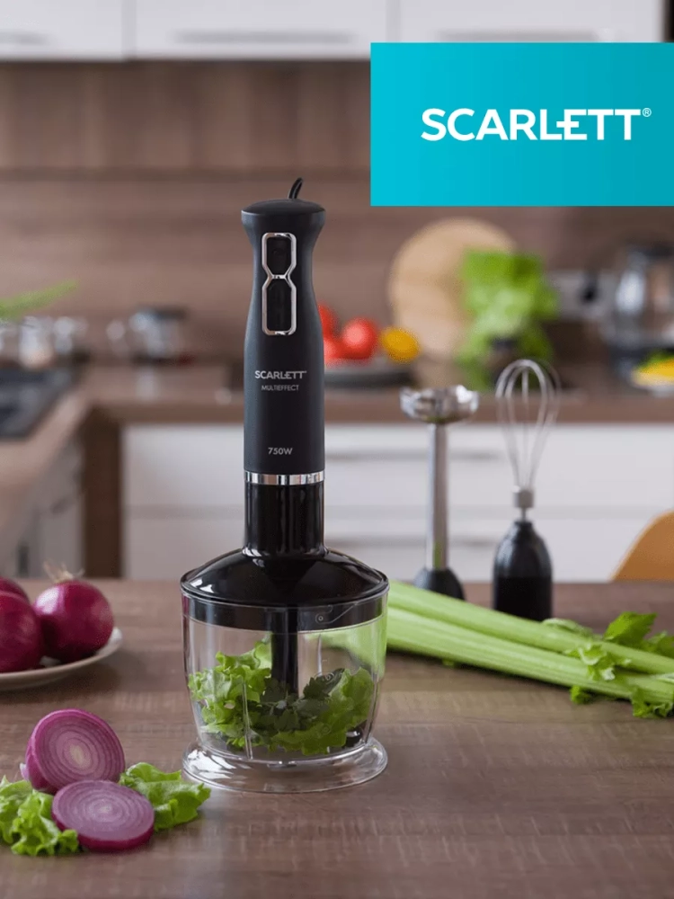 Погружной блендер Scarlett SC-HB42F39- стильная и универсальная техника для кухни, представляющая собой электрический блендер 3 в 1. Он оснащен мощным 750-ваттным мотором, который гарантирует эффективное измельчение и смешивание продуктов. В комплекте с блендером поставляется мини-измельчитель и венчик, что дает возможность легко и быстро измельчать продукты, приготавливать тесто, взбивать крем и выполнить другие кулинарные задачи. Кроме того, данный блендер совместим с супер точным и острым ножом MULTIEFFECT, который обеспечивает идеальное измельчение и смешивание продуктов, сохраняя их полезные свойства. Погружной частью блендера изготовлена из прочной нержавеющей стали собственной марки STEEL PRO, а компактный диаметр корпуса 42 мм обеспечивает удобство использования и позволяет прибору лежать комфортно в ладони. Блендер имеет 14 скоростных режимов, которые позволяют выбрать оптимальную скорость в зависимости от типа продуктов и желаемого результата. Это делает его идеальным для приготовления детского питания и смесей, так как позволяет достичь нужной текстуры и консистенции пищи для малышей. Этот портативный блендер также идеально подходит для приготовления коктейлей, пюре и других напитков, а также будет служить отличным помощником для молодых мам, которые готовят детское питание и смеси. С его помощью вы сможете разнообразить свой рацион и насладиться свежими и вкусными напитками в любое время. Блендерный набор 3 в 1 с венчиком и мини-измельчителем, делают его универсальным инструментом для измельчения, смешивания и приготовления различных блюд. Все эти особенности делают погружной блендер Scarlett SC-HB42F39 отличным выбором для тех, кто ценит качество, функциональность и удобство приготовления пищи. Он будет радовать вас каждый день и станет прекрасным подарком для любителей вкусной и здоровой еды.
